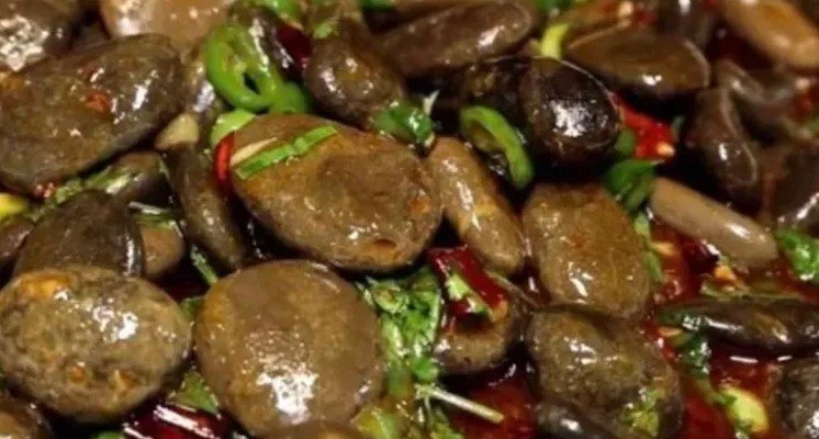 Se supone que los clientes chupan las pequeñas rocas para saborear el rico y picante sabor del platillo, que se originó en la provincia de Hubei