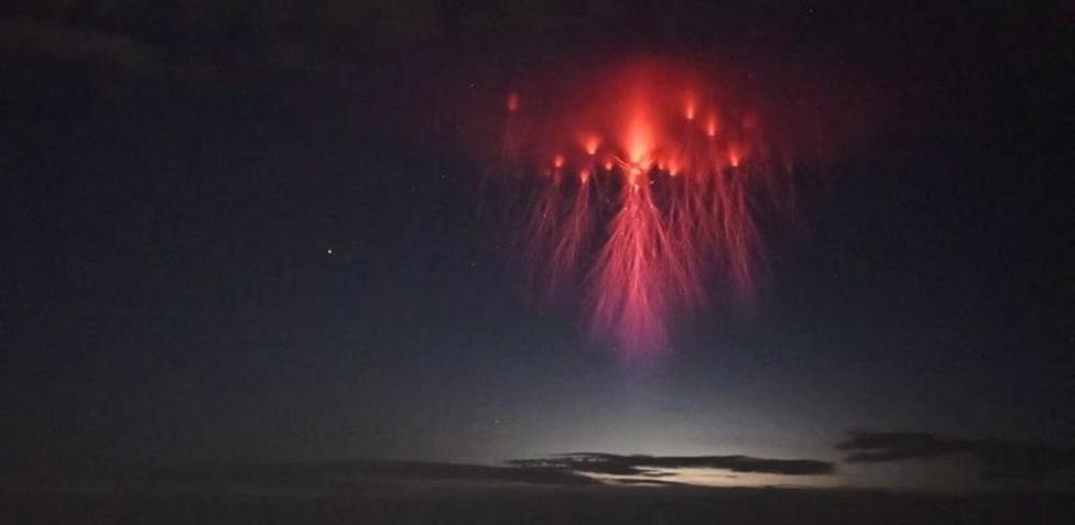 Sprite o espectro rojo, un relámpago bonito, pero que no caemos en él. Este tipo de relámpago se distingue, sobre todo, por ocurrir a mucha más altitud, ya que se produce por encima de las nubes en tormentas intensas en la parte de la atmósfera denominada mesosfera.