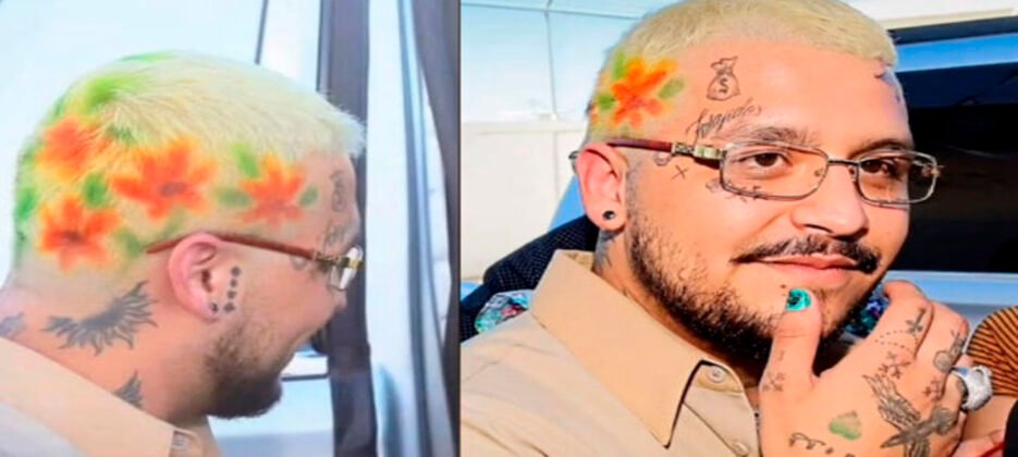 Los múltiples tatuajes en su rostro no fueron suficientes, para la ocasión el cantautor llegó con el pelo corto teñido de rubio, con flores, en tonos verdes, rojos y naranjas brillantes.